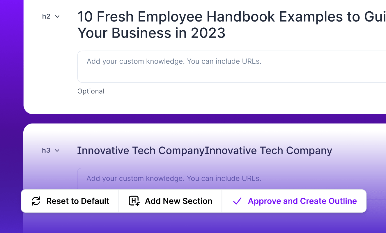 It then provides you with an option to customize the article outline with writing points, suggests the best-performing tone of voice, and lets you add custom knowledge, to make sure each article is unique, brand-coherent, and ready to boost your E-E-A-T score. If you like, you can also activate the anti-AI detection boost before generating the article.