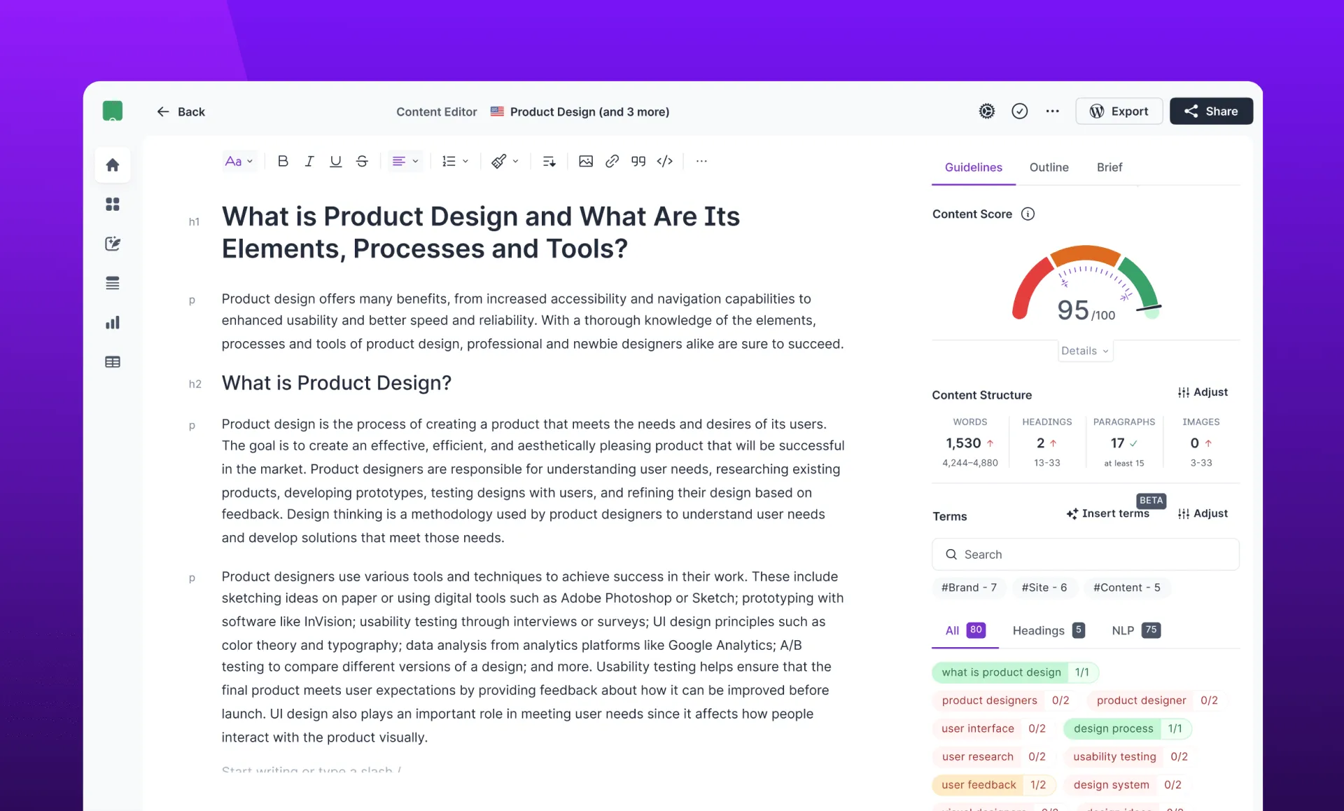 The tool combines NLP solutions, machine learning, an analysis of over 500 web signals, and SERP analysis with the capabilities of several generative AI models (GPT 4 in 32k version, among others) to create unique content that answers the user intent and ranks high. All guidelines are real-time, competition-based, and Google-compliant.