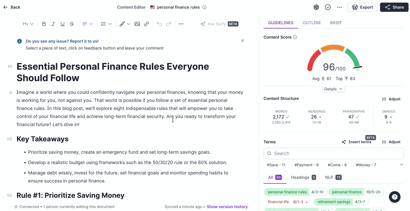 The AI text generator optimizes your article in Esurfer’s Content Editor, where you can see the content score and which secondary and related keywords your content covers.