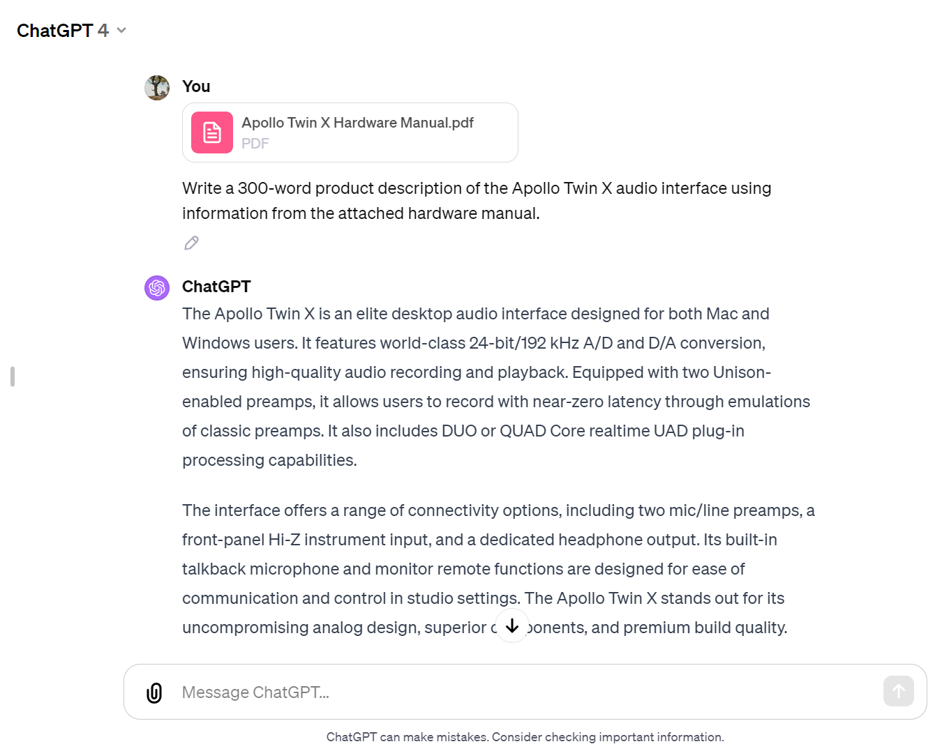 Here we uploaded the hardware manual of a product and prompted ChatGPT to write a product description using information from the provided document.