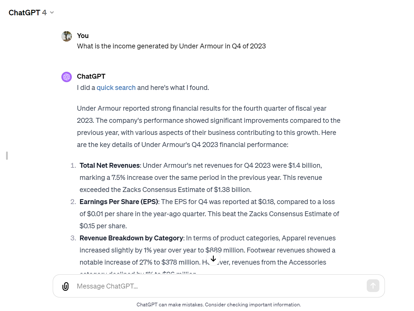 For example, here we've asked the tool to provide details on the income generated by a brand in Q4 of 2023. ChatGPT wouldn't have been able to provide an accurate response with its April 2023 restricted knowledge.