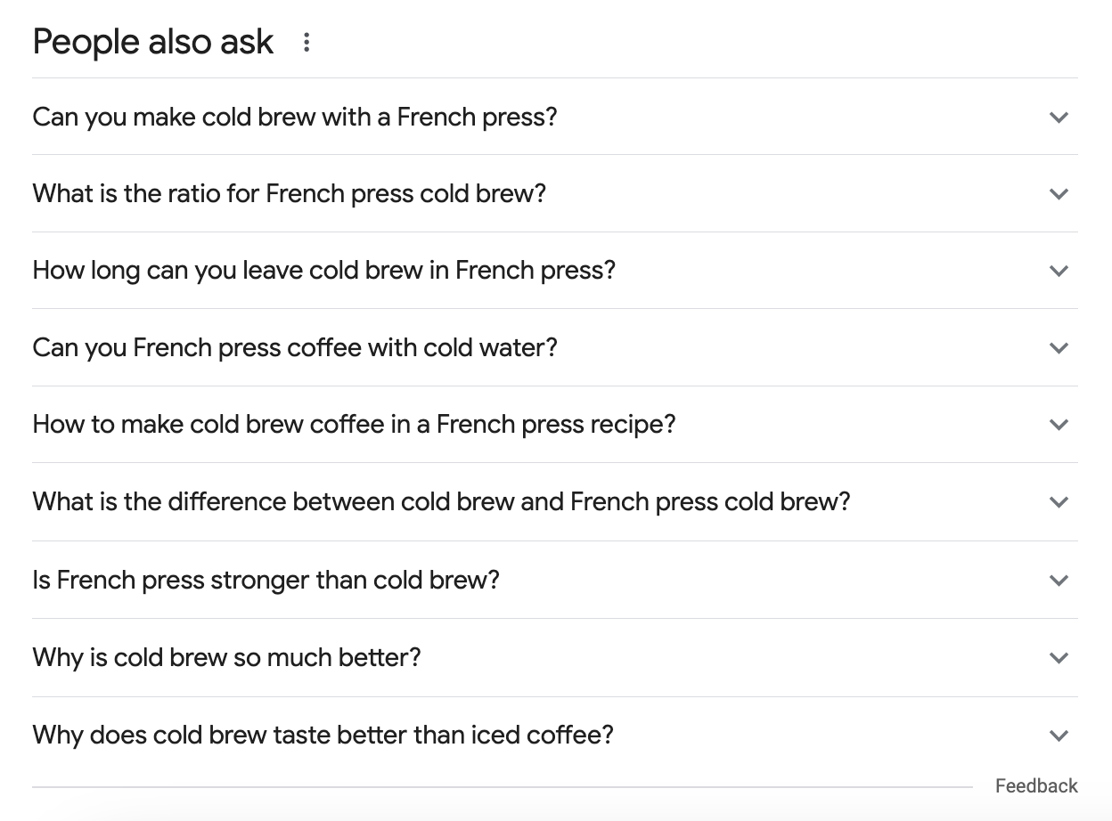 The People also ask section is a good place to start. For instance, "Can you make cold brew with a French press?" and "What is the ratio for French press cold brew?" can be some possible H2s.