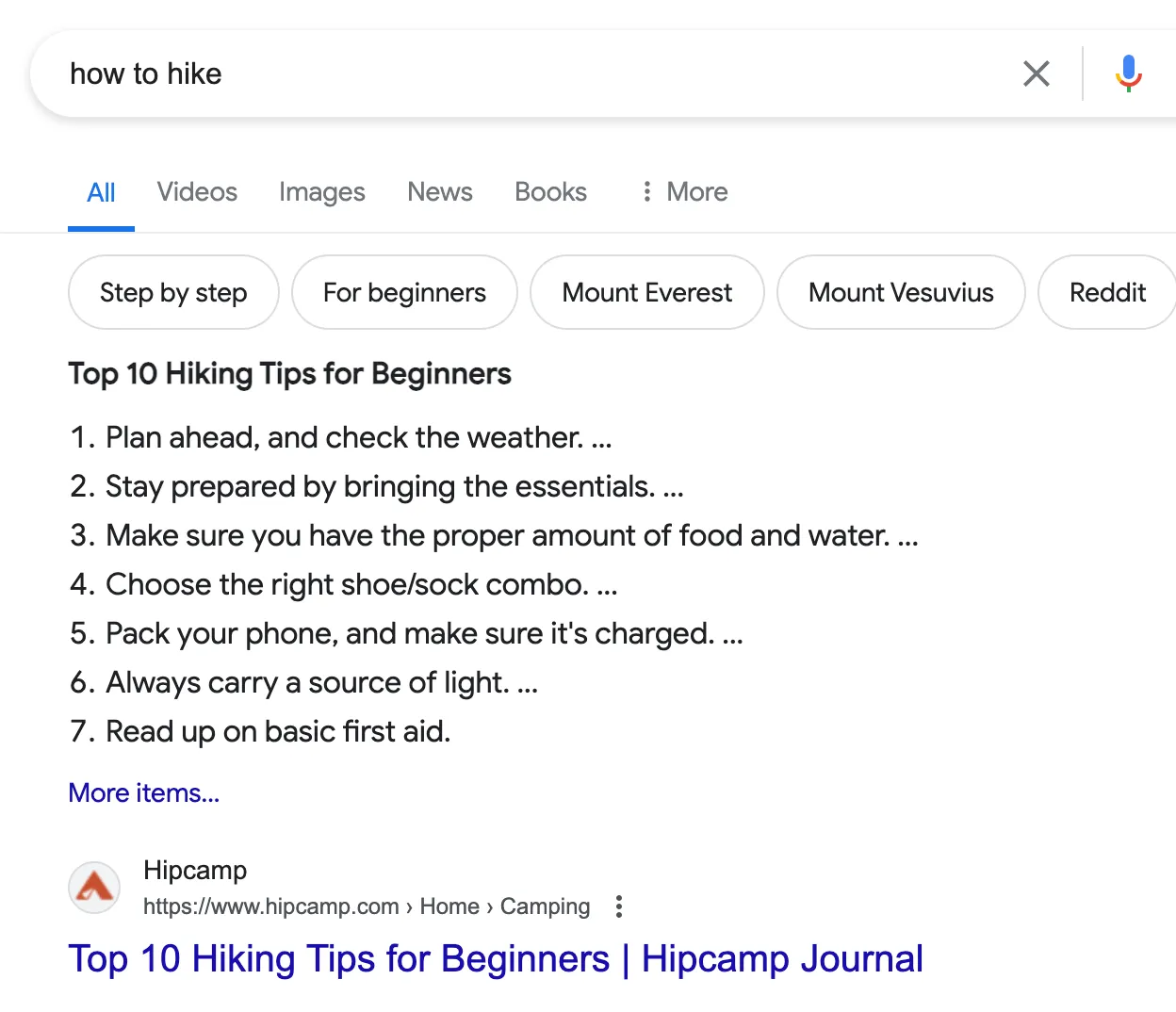 For example, if you look up "how to hike", you'll see that the top-performing pages are informative listicles. This shows that the keyword has an information intent. Users are interested in being educated on the topic.