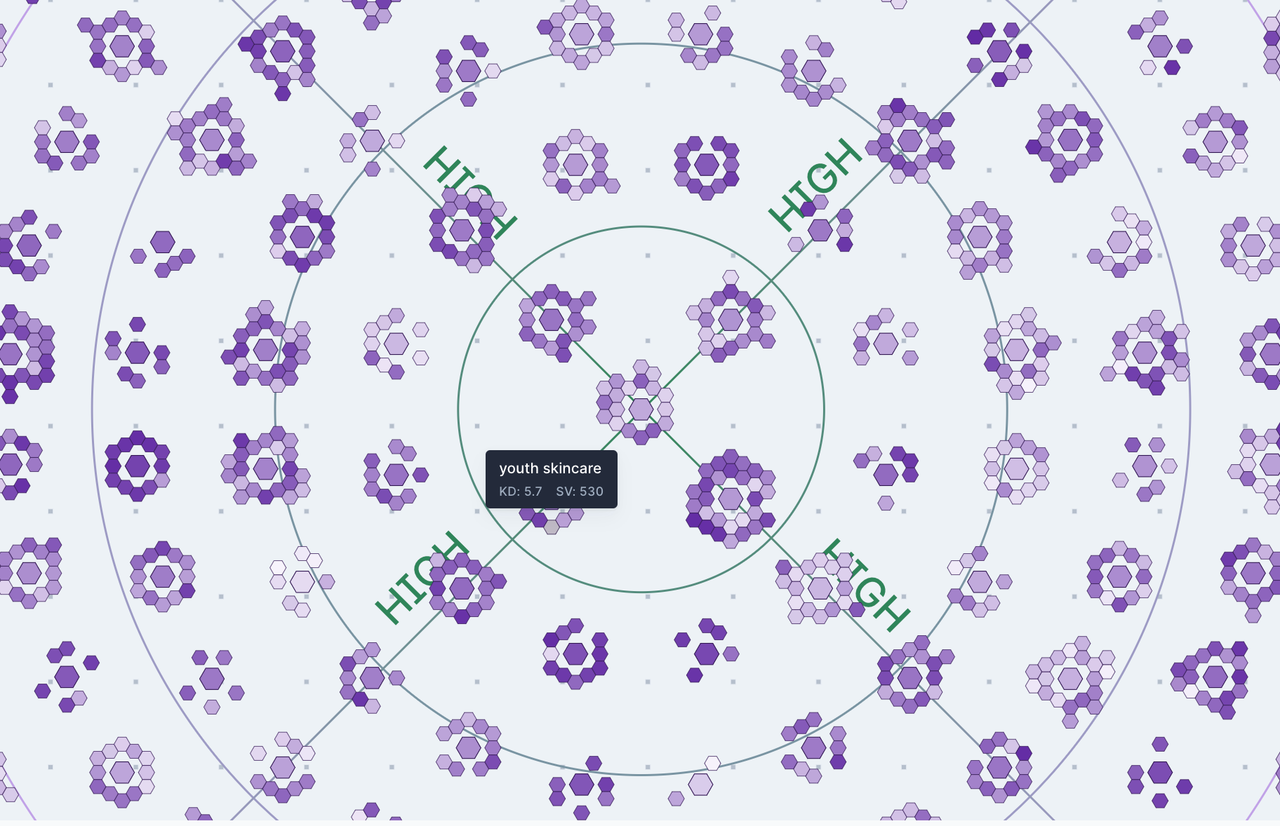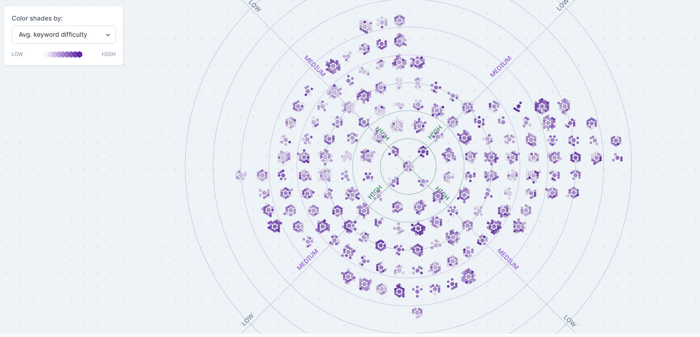 If you find a competitive keyword in a cluster close to the center, target the lighter-colored keywords first. This will help you build some authority in a topic that is already associated with your website.