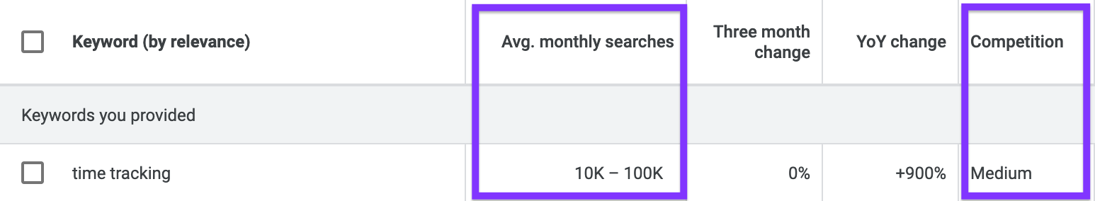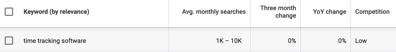 For example, if "time tracking" is too competitive, choose "time tracking software" instead. According to Google Keyword Planner, it has a lower search volume and competition.