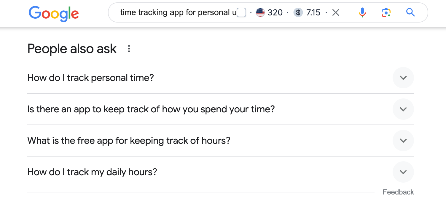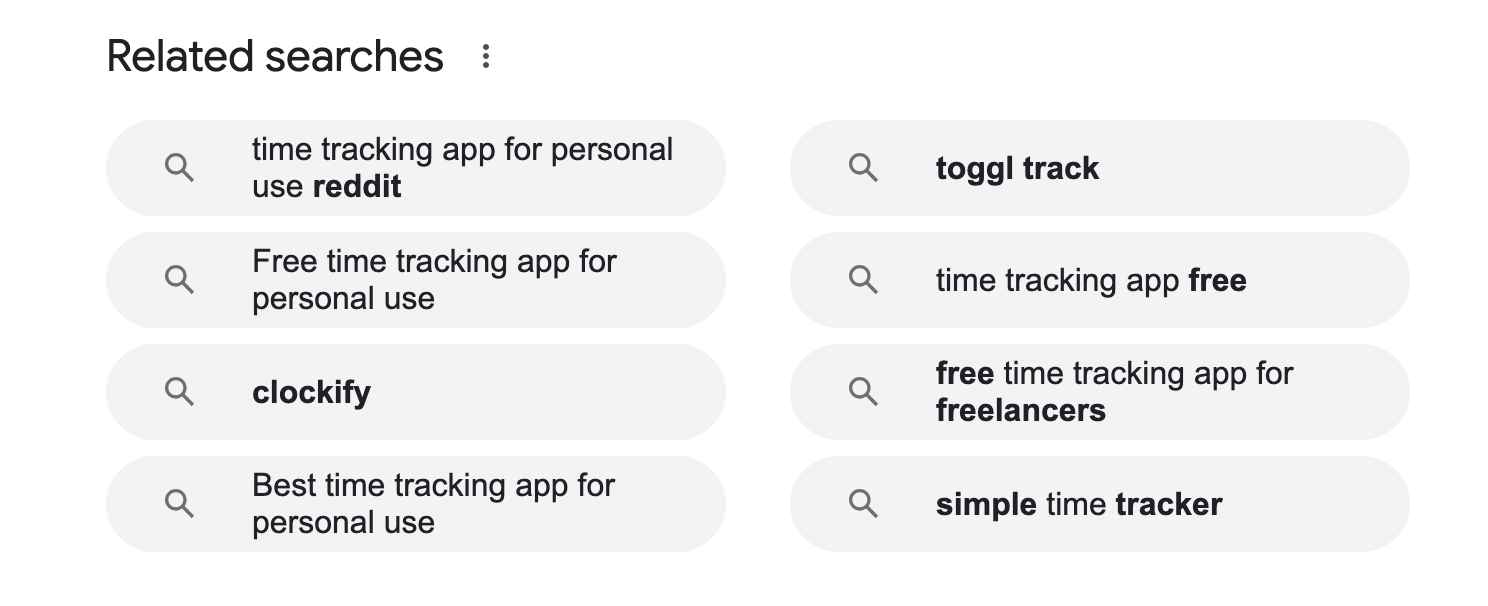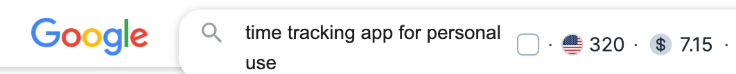 A perfect example of a long-tail keyword is "time tracking app for personal use," which comes up when you start searching for "time tracking."