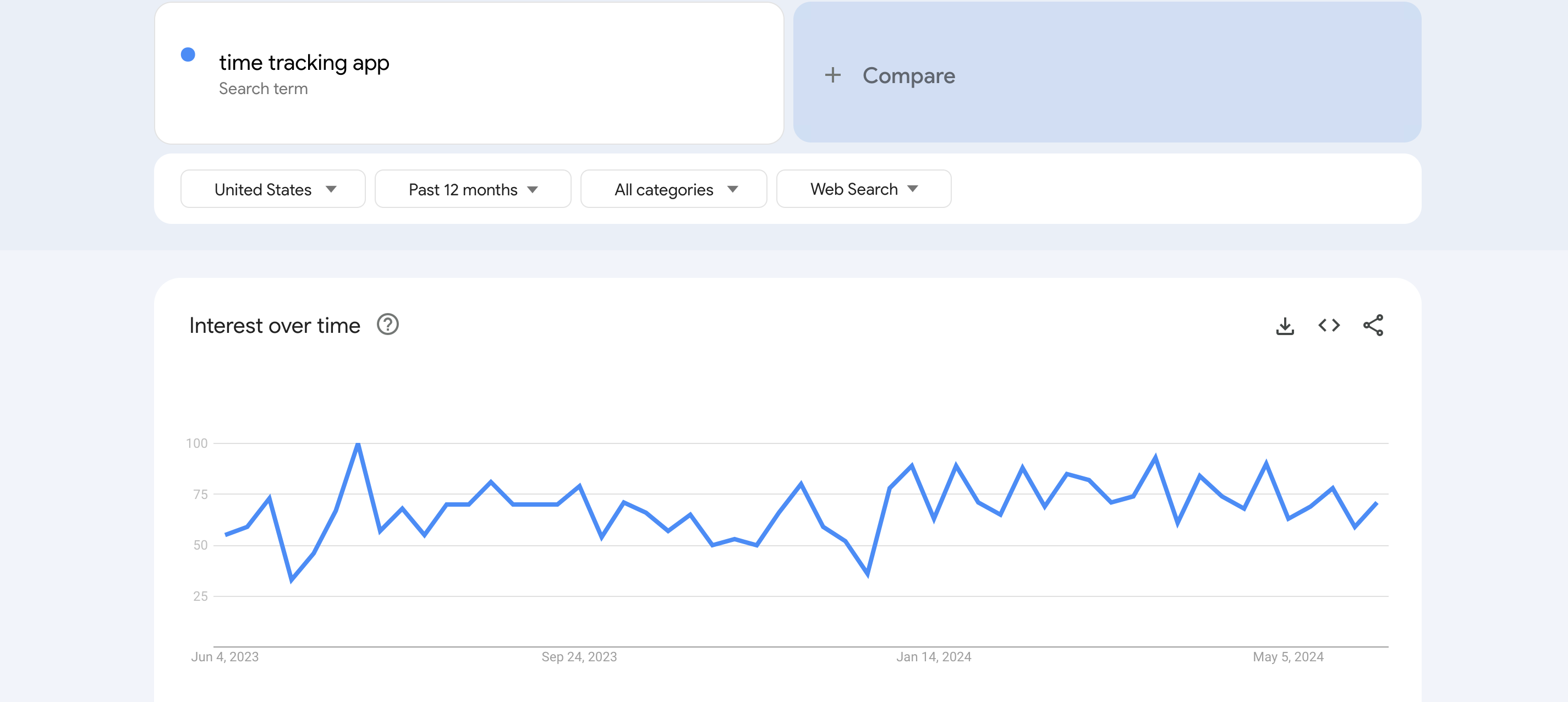 For example, if we search for "time tracking app," we can see a stable interest in this search term over the past year.