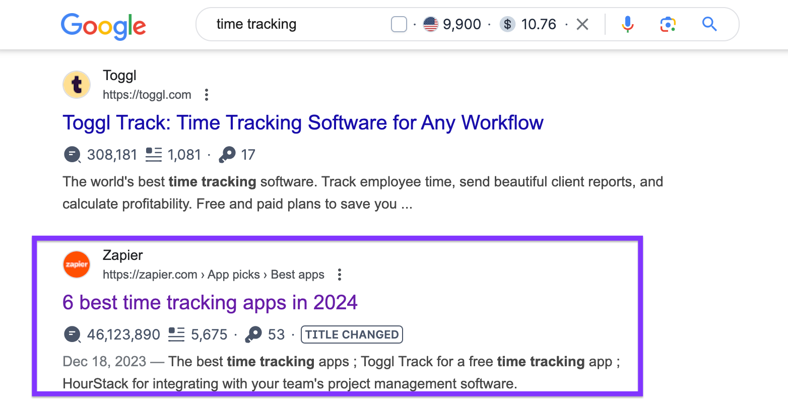 Let's go back to our time tracking example. We can see that Zapier's listicle is among the top results: