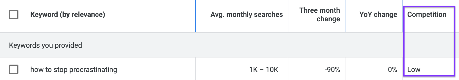 And yet, quick keyword research for "how to stop procrastinating" will show you that the keyword has low competition while offering plenty of traffic potential.