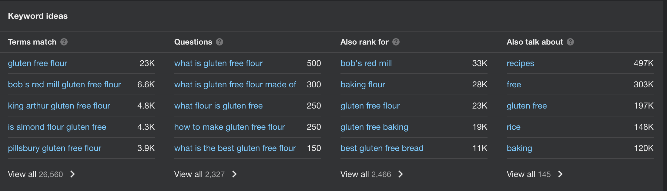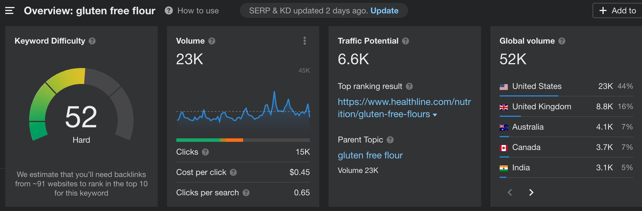If we take our "gluten-free flour" example and type it in, it will tell us the keyword difficulty, monthly search volume and traffic potential