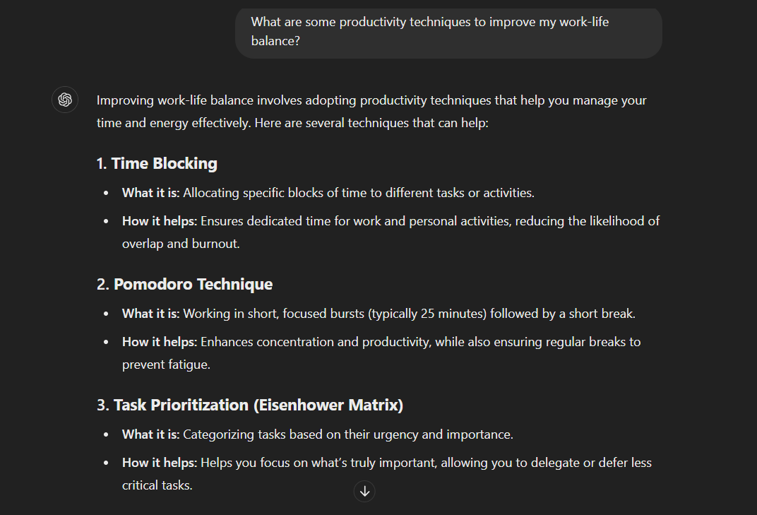 Sticking with the example above, here's what happens if I type in "What are some productivity tips to improve my work-life balance?" instead: