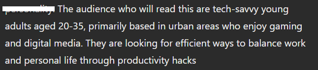 “The audience who will read this are tech-savvy young adults aged 20-35, primarily based in urban areas who enjoy gaming and digital media. They are looking for efficient ways to balance work and personal life through productivity hacks.”