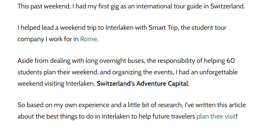 For example, "I helped lead a weekend trip to Interlaken" clearly shows readers she is qualified to share the tips mentioned in the blog post.