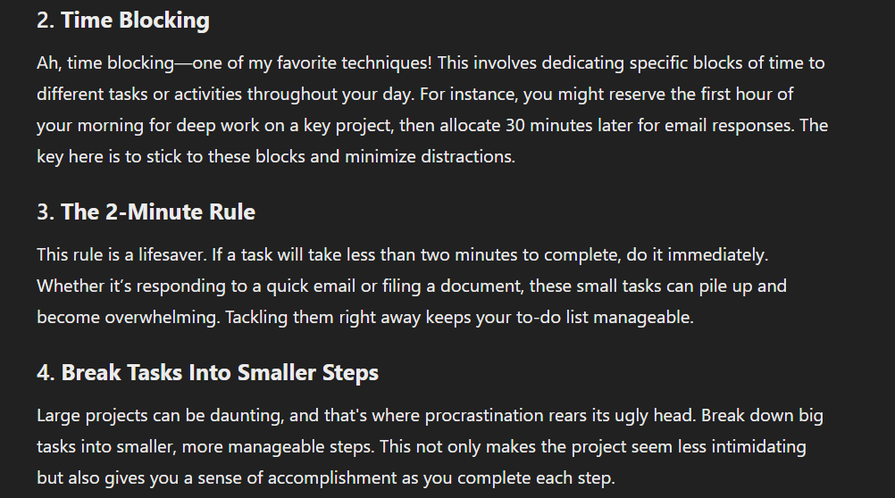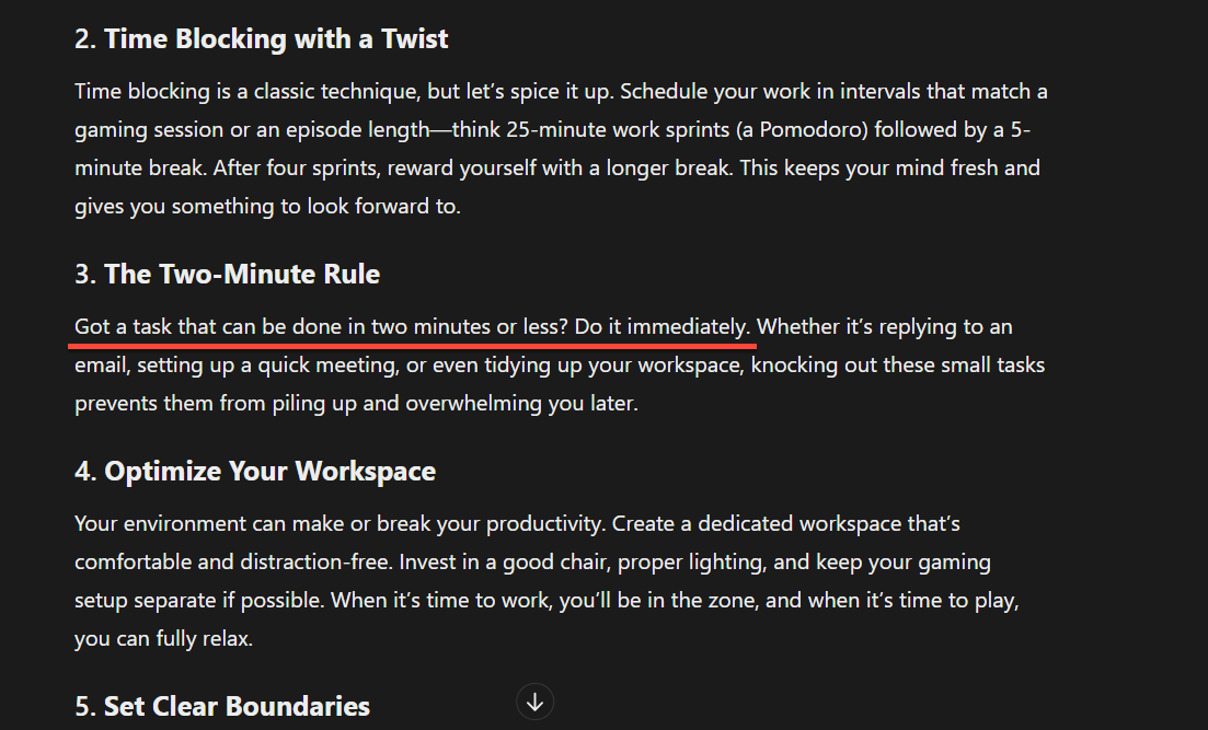 Notice the difference in the language of the third point, "the two-minute rule," between the two outputs when we provide the target audience.