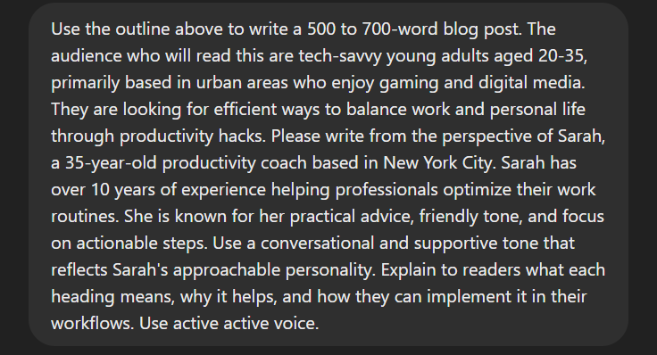 Specifying who your target audience is in your prompts gives the language model further context on what style and tone it should adopt while you get to spend less time editing the output.