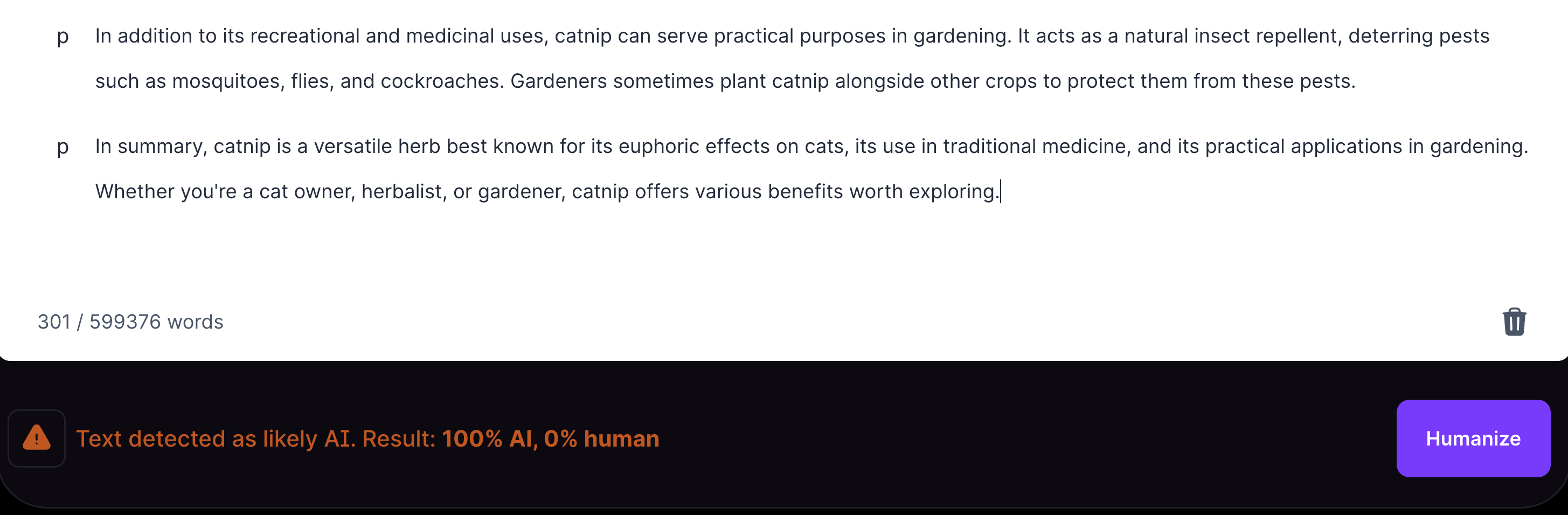 As mentioned, AI tools tend to go heavy on cliche terms, which are easy to pick up by both AI detectors and readers.