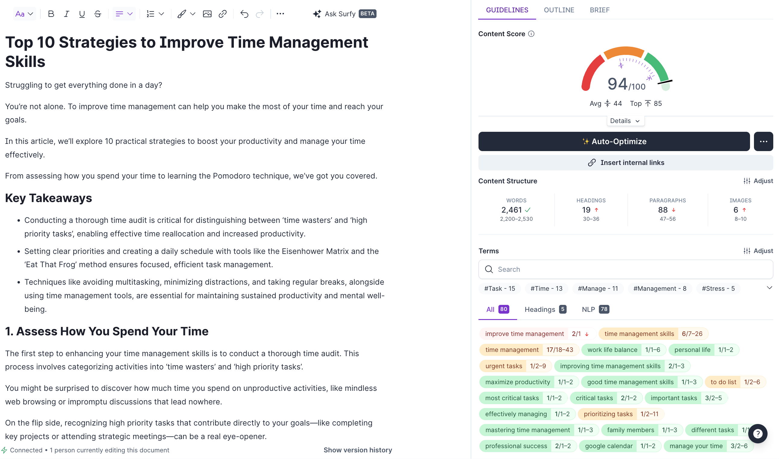 You can use Esurfer AI to draft your first version and then edit it using the tips I've shown in this article. For example, writing an article on improving time management only requires you to enter the main keywords you're targeting.