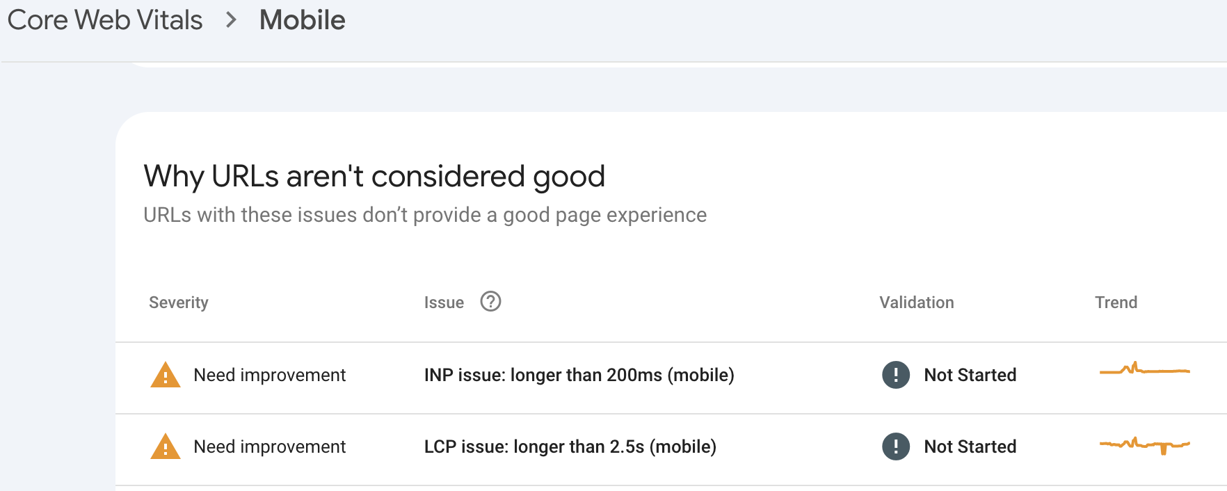 Start with Google Search Console (GSC) > Core Web Vitals > Mobile.