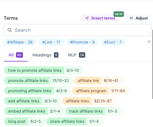 If you're struggling to find semantic keywords, Surfer's Content Editor can help. The editing window will show you relevant keywords and suggests the ideal number of times to use each, removing all guess work and hassle from the keyword research process.