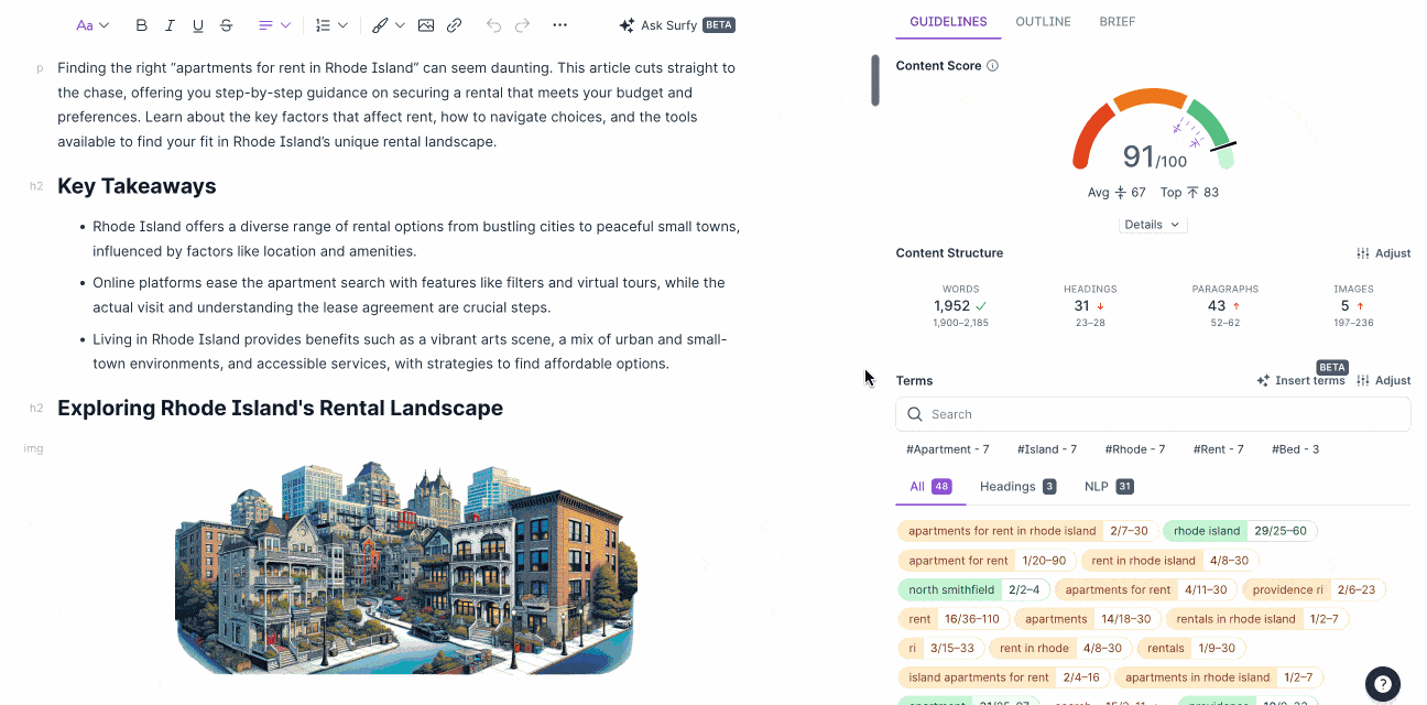 With Surfer, you never need to take shots in the dark. You get lots of invaluable keyword insights that help you make data-driven decisions, and the Content Editor tells you exactly what your content needs to rank well.