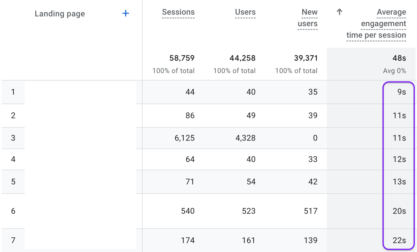 - Sort the column labeled "Average engagement time per session" in ascending order