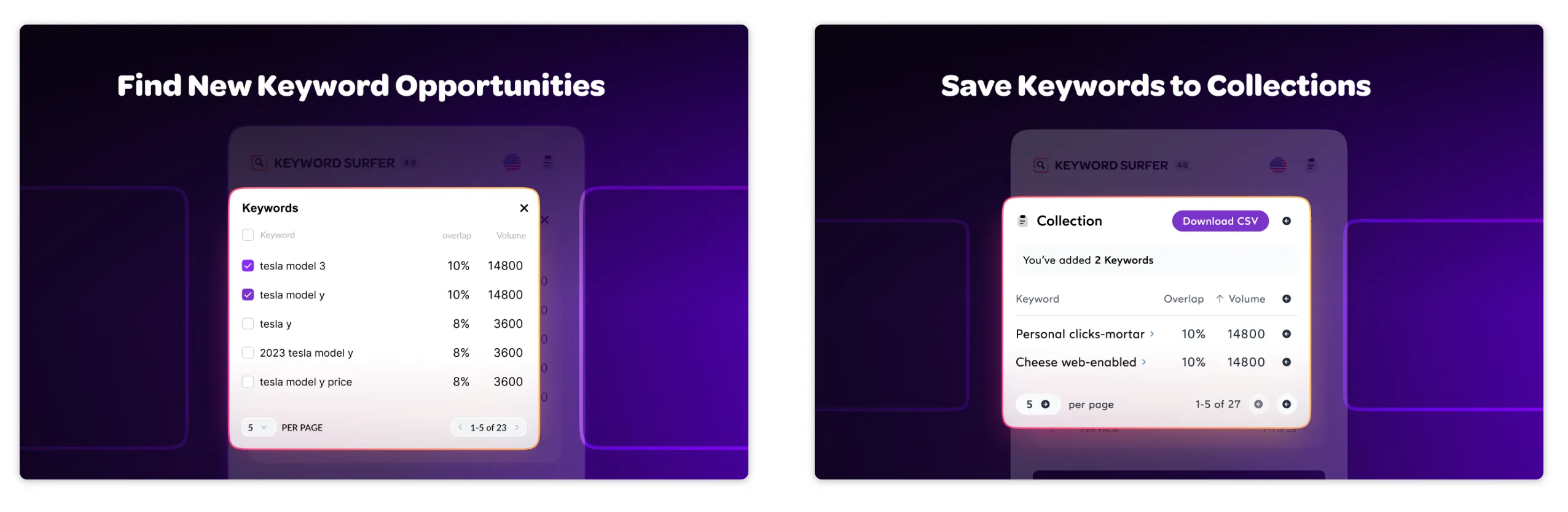 Keyword Esurfer also lets you save Collections from the provided keyword ideas, which you can export as CSV files. Simply tick the box next to each keyword to add to your collection.