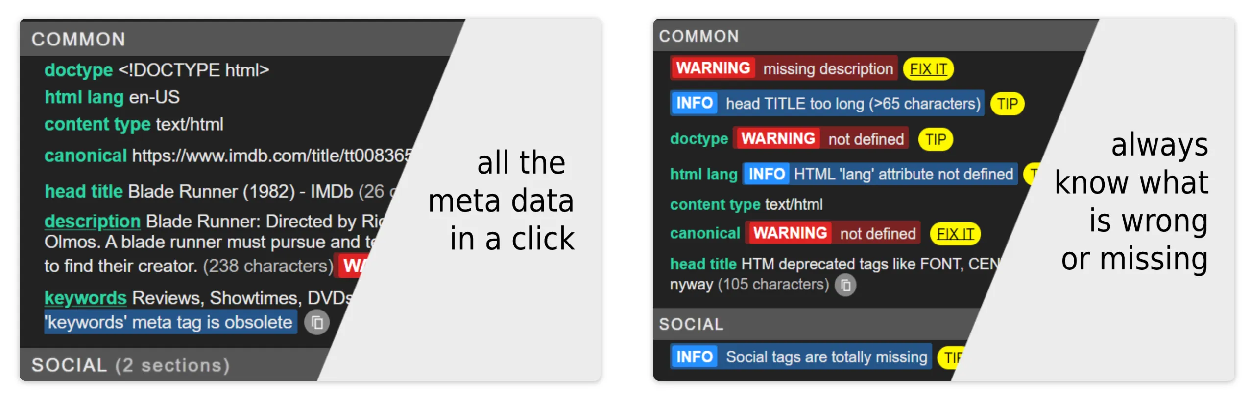 Besides outlining the page's metadata, Meta SEO Inspector also gives you actionable advice on fixing common errors.