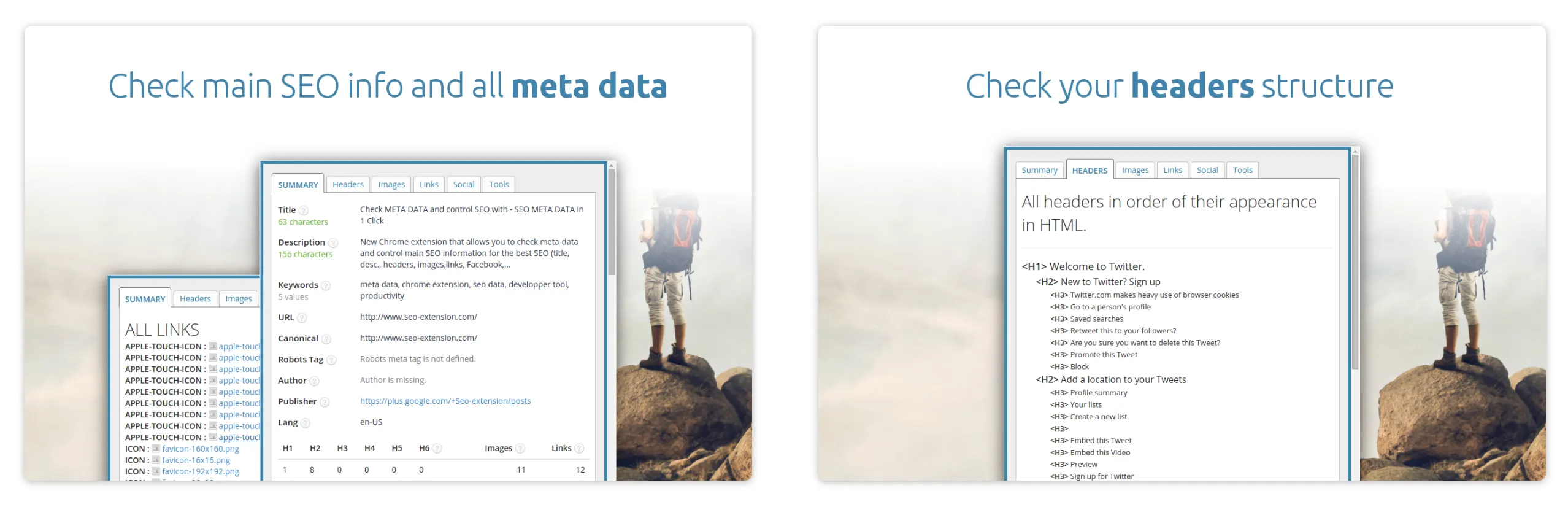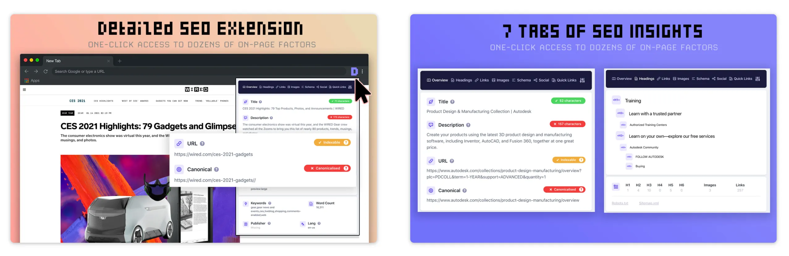 Detailed SEO Extension gives you access to various on-page data, such as metadata, schema markup, links, and headings.