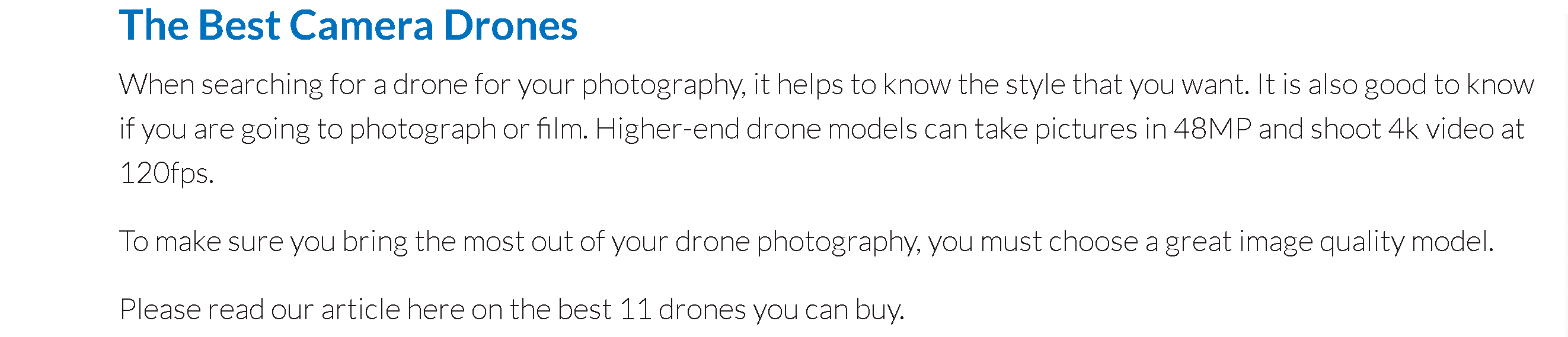 Expert Photography responds to this search query with a detailed guide on drone photography. The guide lightly touches the best camera drones, but only advises the reader to check them out in another article.