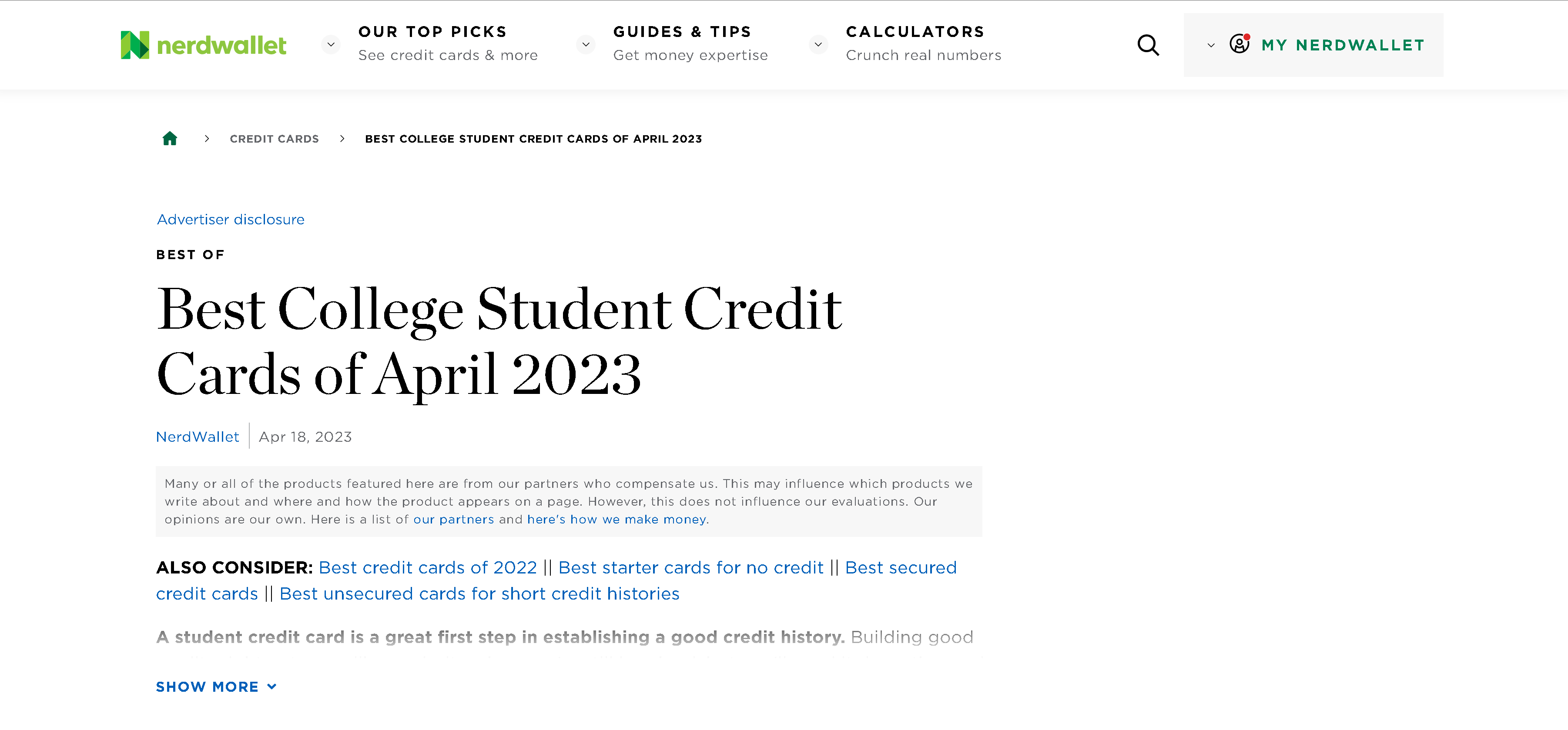Instead of creating one article and updating it every year, Nerdwallet's page on the best credit cards for college students is updated every month to give evergreen search results to that search term.