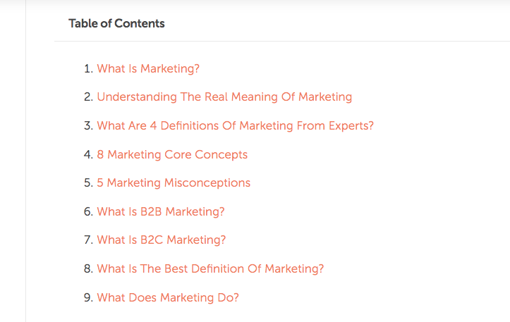 - Hub- Content focuses on high-volume targeted keywords—E.g., Content marketing.