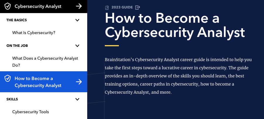 For example, in the subject guide “How to Become a Cybersecurity Analyst,” there are articles on cybersecurity tools, cover letters and career prospects.